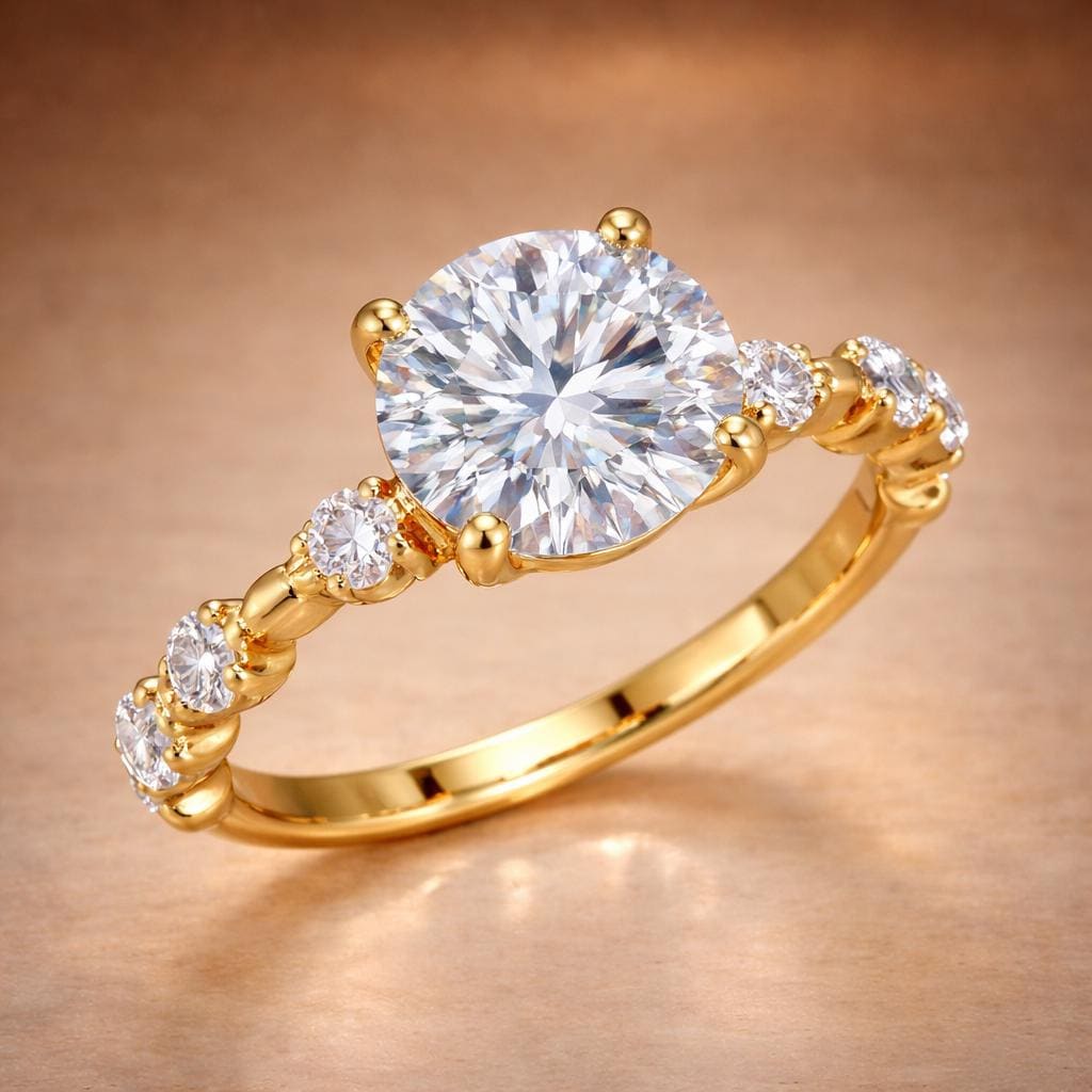• Style: Elegant round solitaire with side diamonds