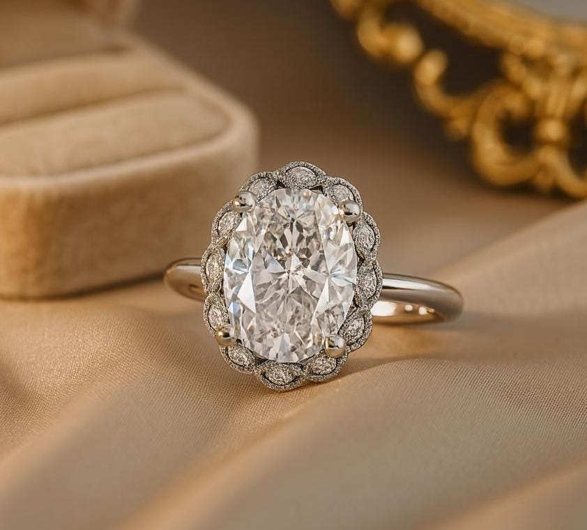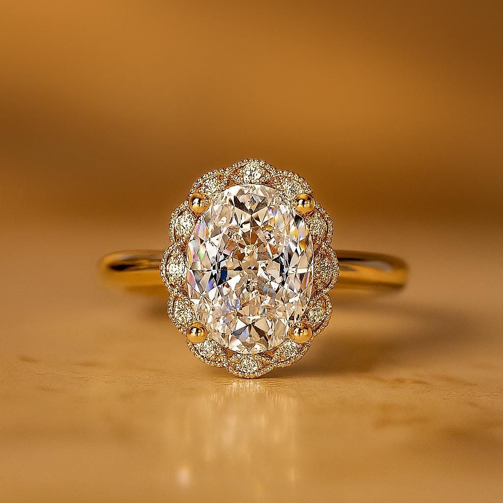 1 Carat Oval Natural Diamond Engagement Ring | GIA Certified, Vintage Halo, 14K Yellow Gold