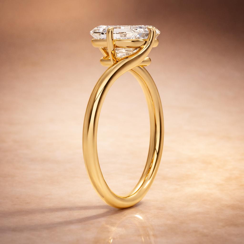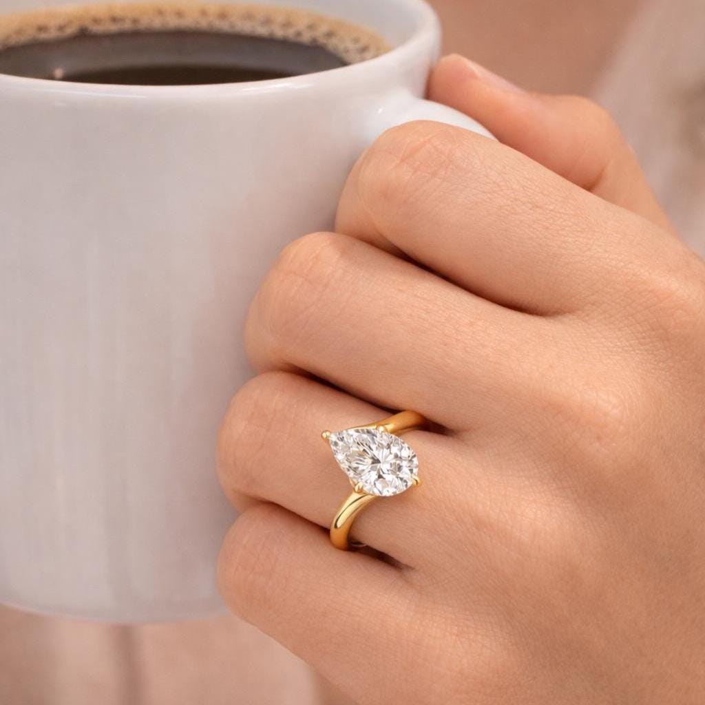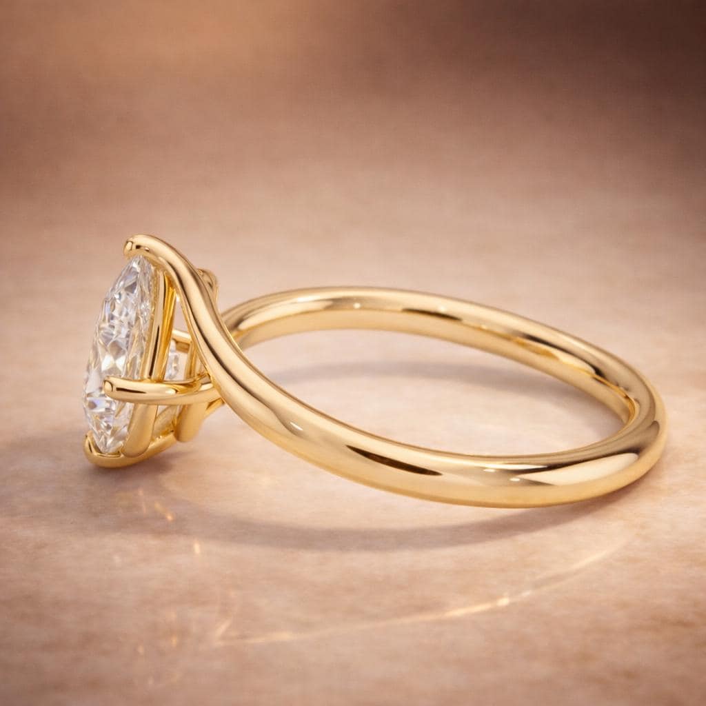 Radiating elegance and timeless charm, this exquisite engagement ring features a brilliant 3-carat pear-shaped diamond at its heart, a Solitaire With a Twisted Band, all set in rich, solid 14K gold. The warm glow of the gold band enhances the sparkle of the diamond, creating a luxurious yet delicate look.