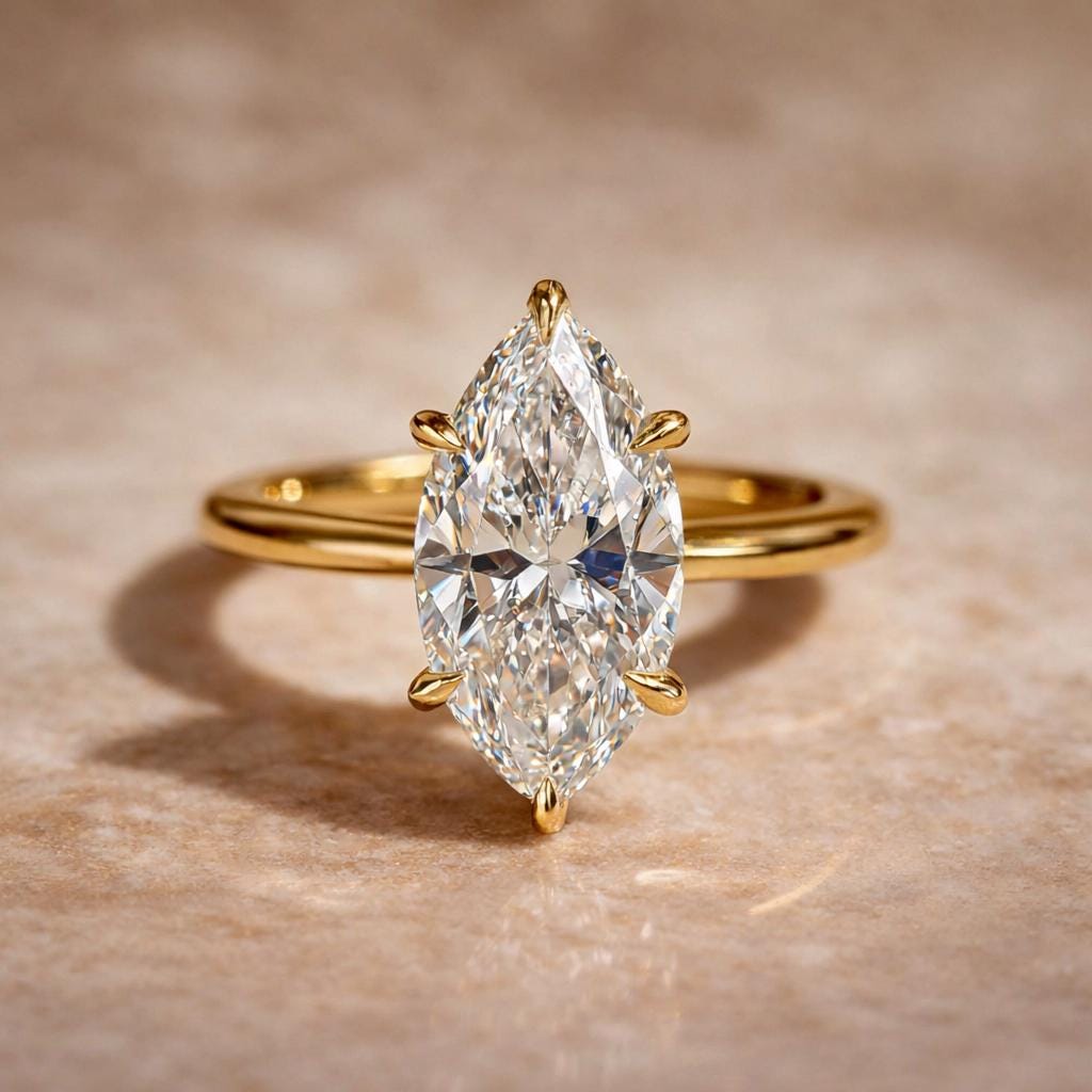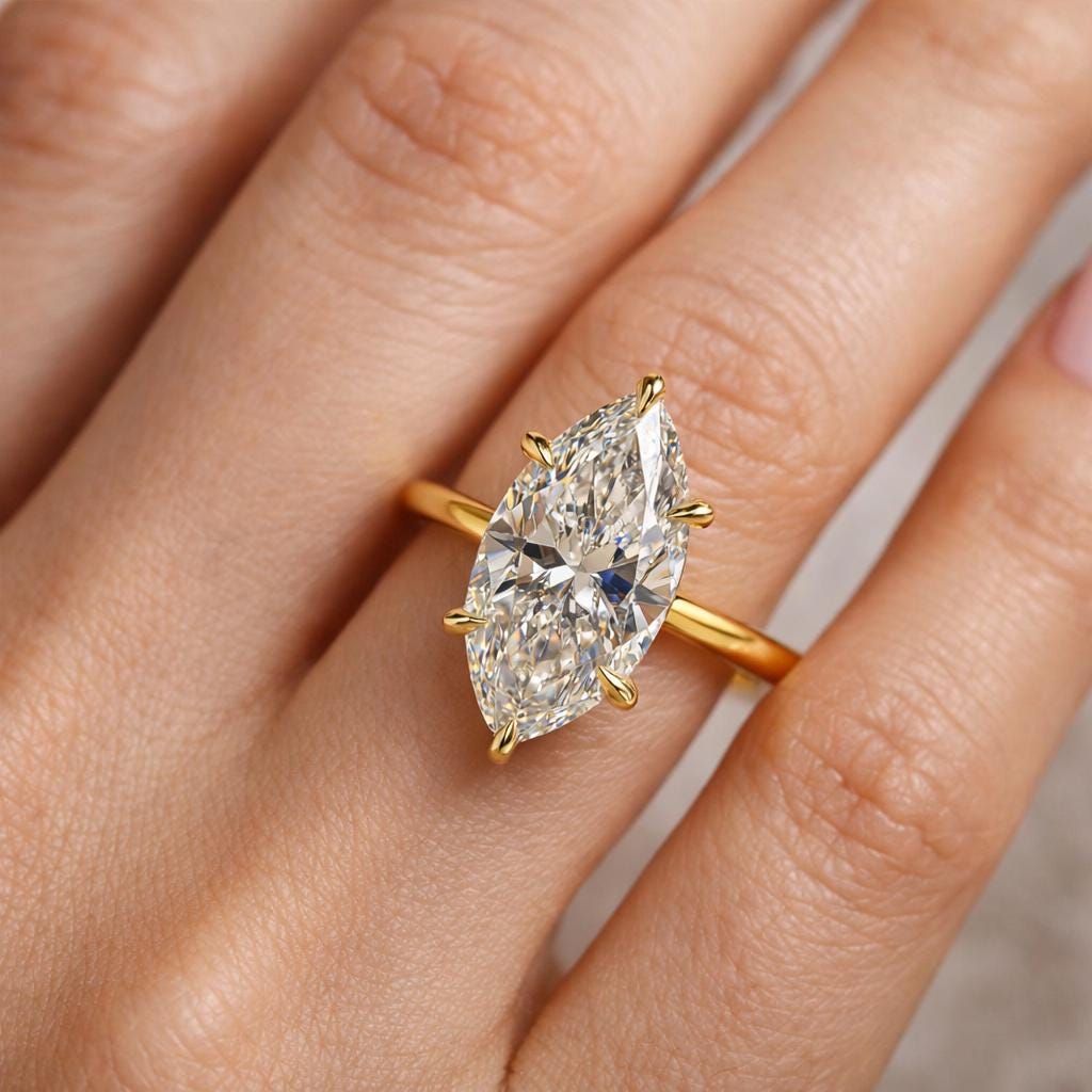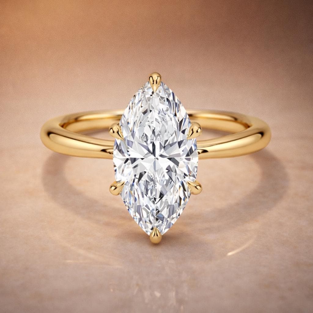 Radiating elegance and timeless charm, this exquisite engagement ring features a brilliant 2-carat marquise-shaped diamond at its heart, all set in rich, solid 14K gold. The warm glow of the gold band enhances the sparkle of the diamond, creating a luxurious yet delicate look.