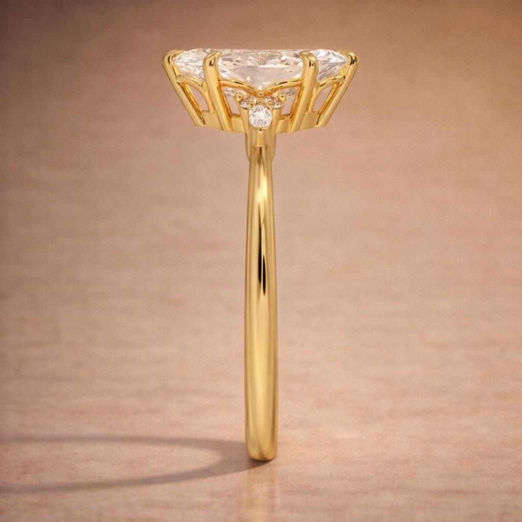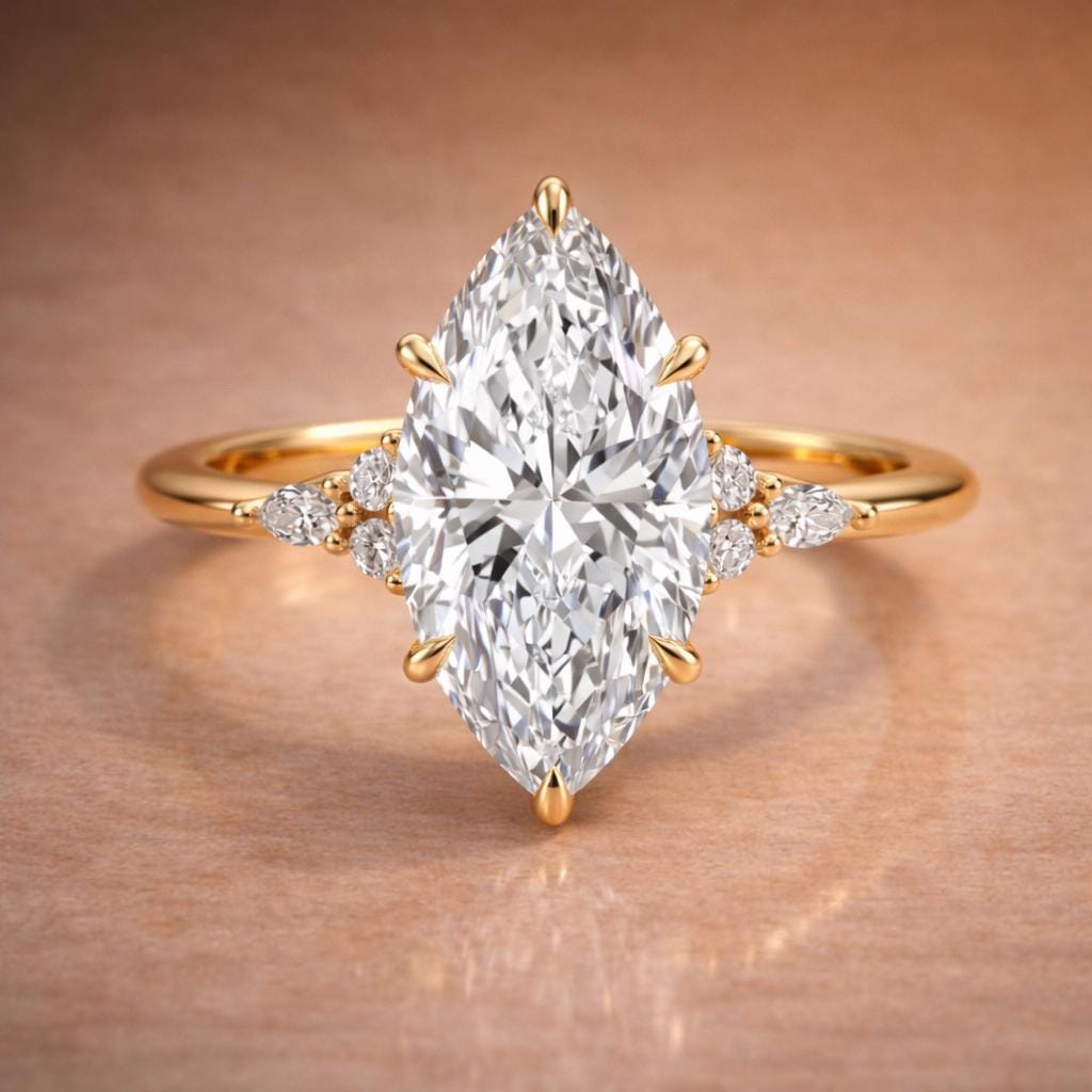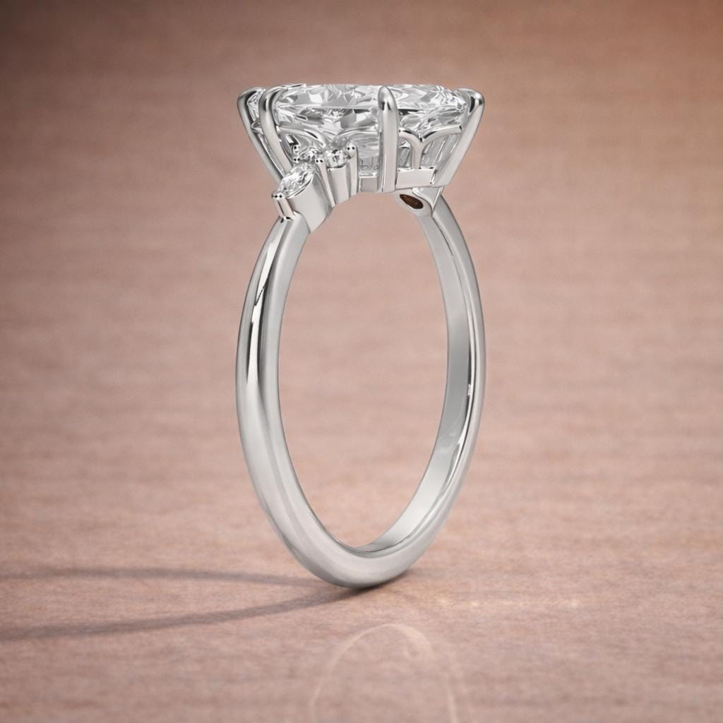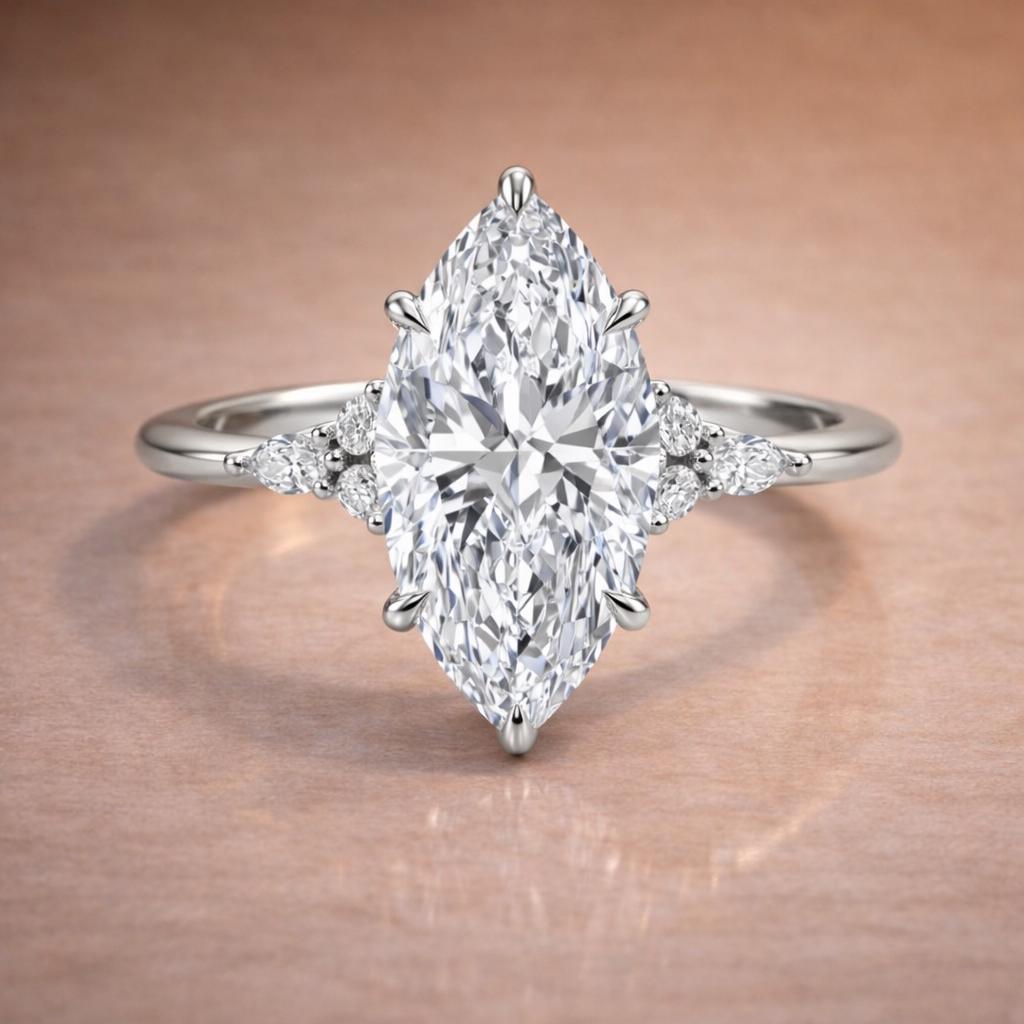 This marquise lab-grown diamond engagement ring features a radiant 4 carat center stone paired with a beautifully balanced diamond cluster design, creating a look that is both classic and eye-catching.