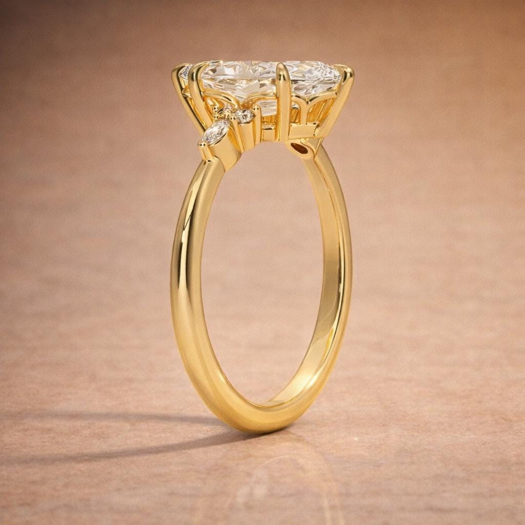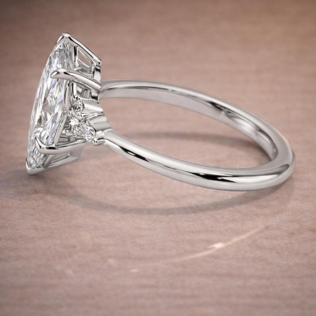 This marquise lab-grown diamond engagement ring features a radiant 4 carat center stone paired with a beautifully balanced diamond cluster design, creating a look that is both classic and eye-catching.