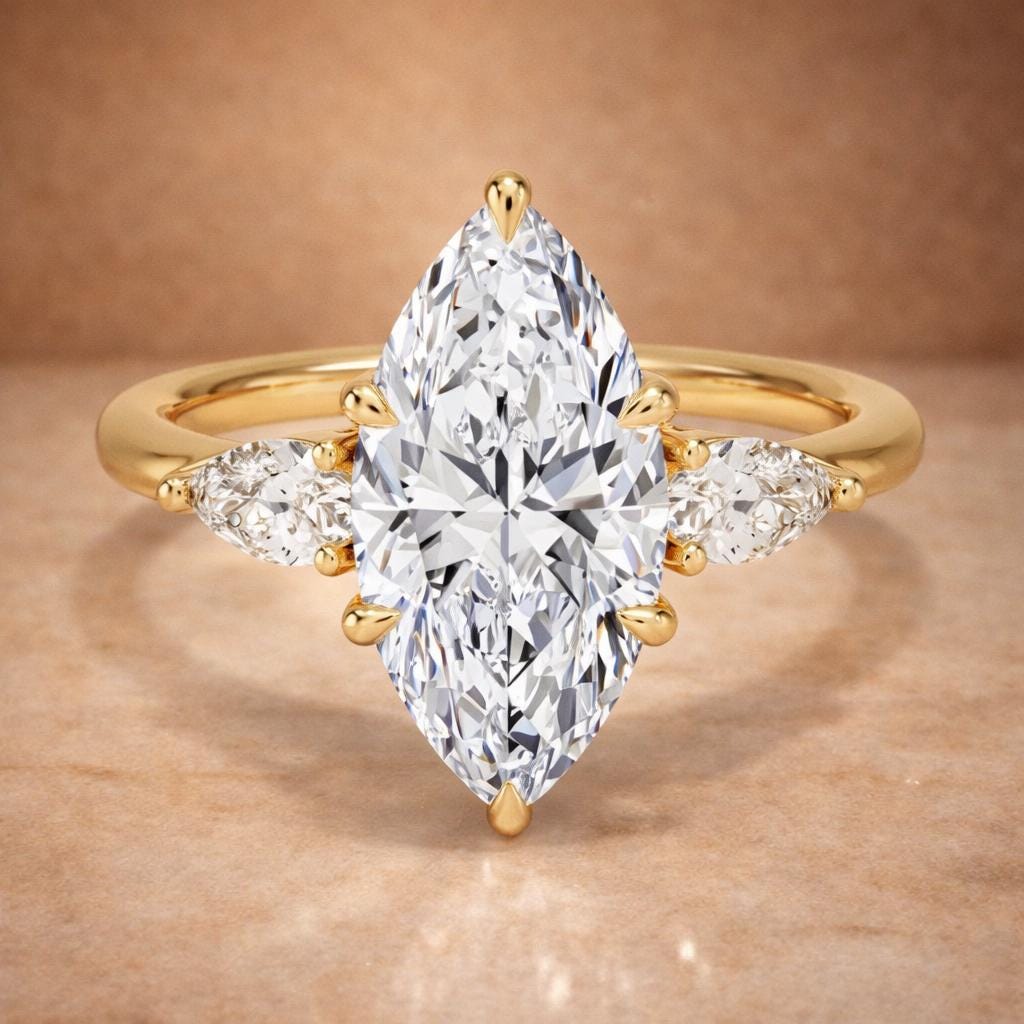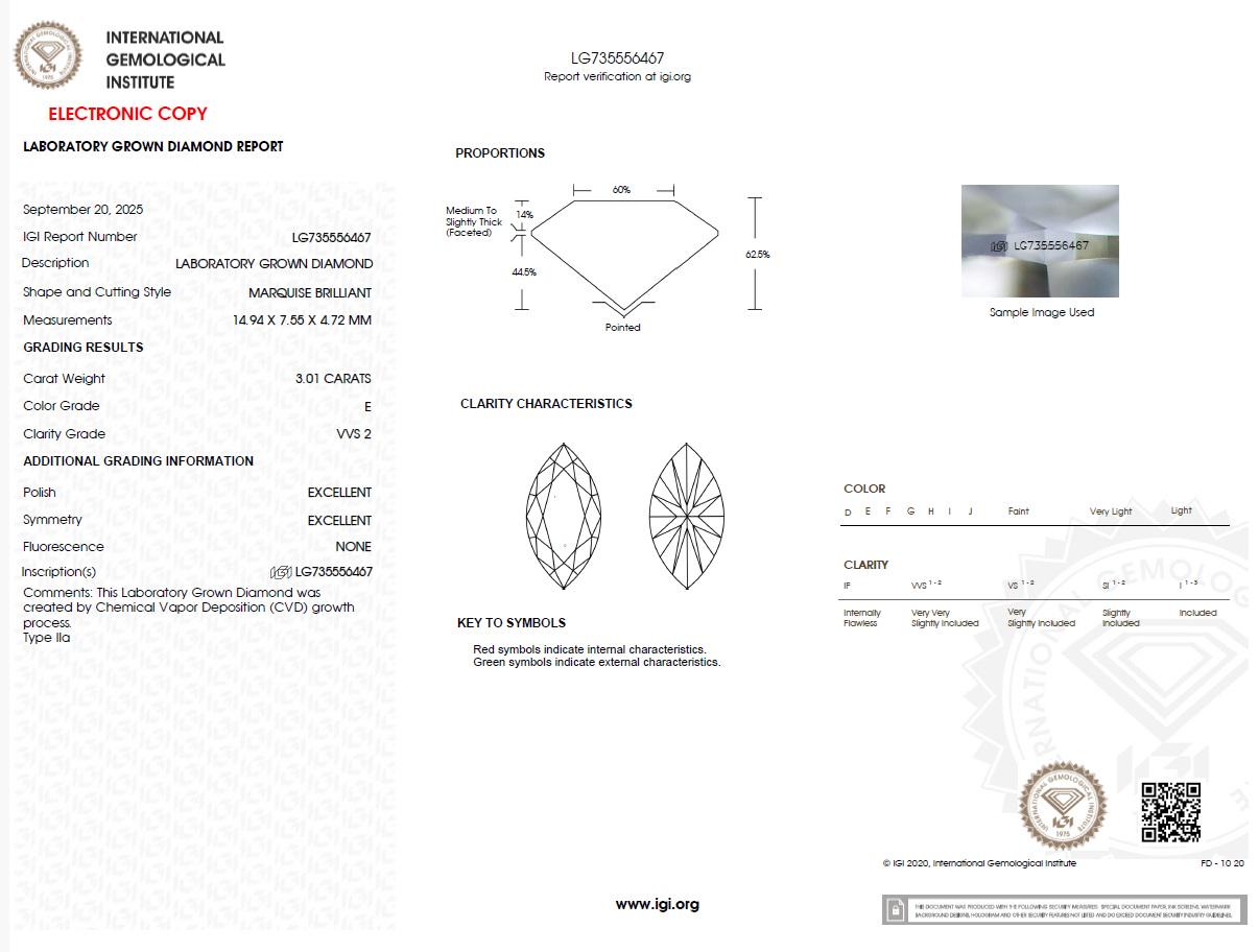 This stunning engagement ring features a 3 carat marquise-cut lab-grown diamond at its center, IGI certified for quality and authenticity. The elongated marquise shape creates a flattering, finger-lengthening look with exceptional brilliance.