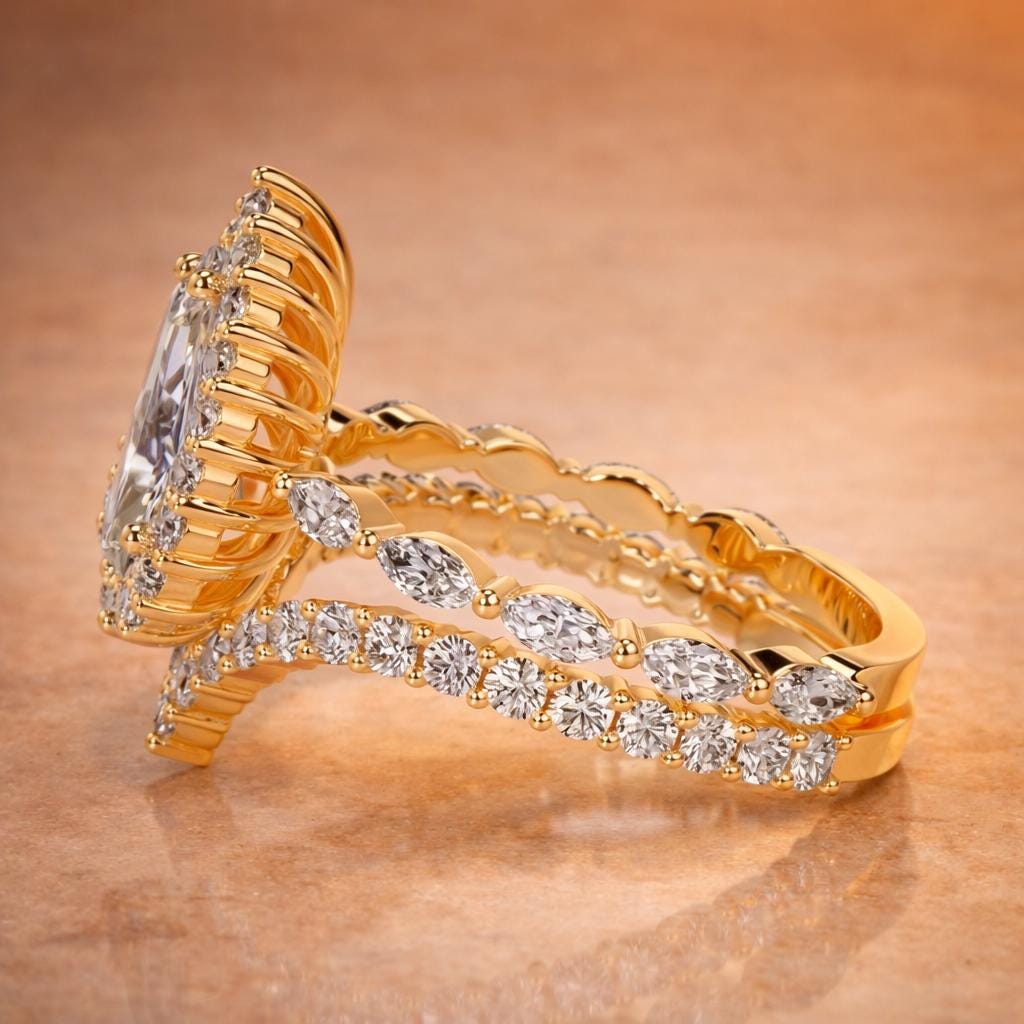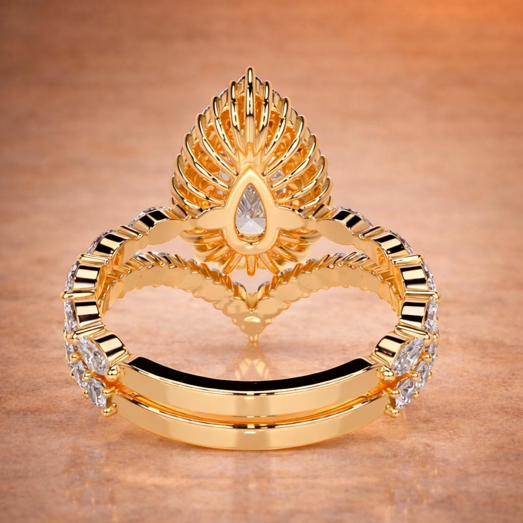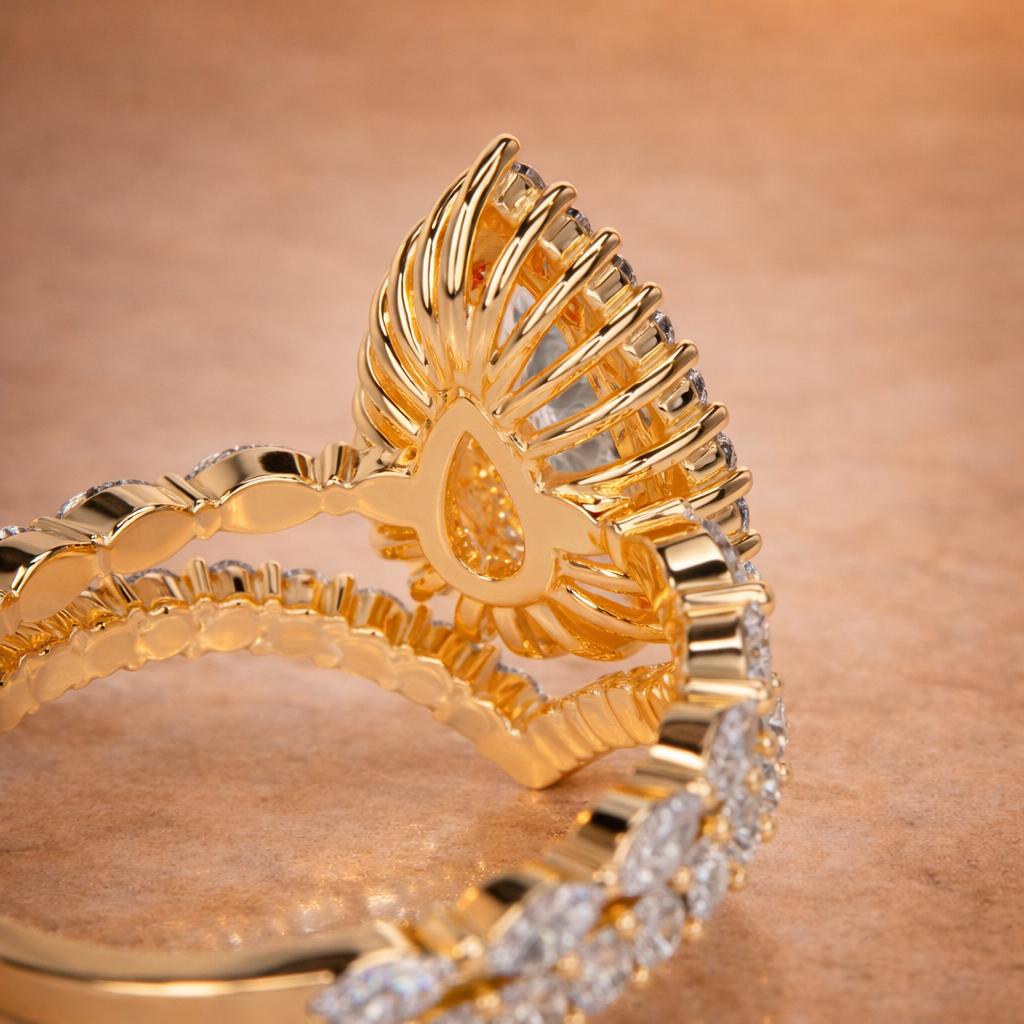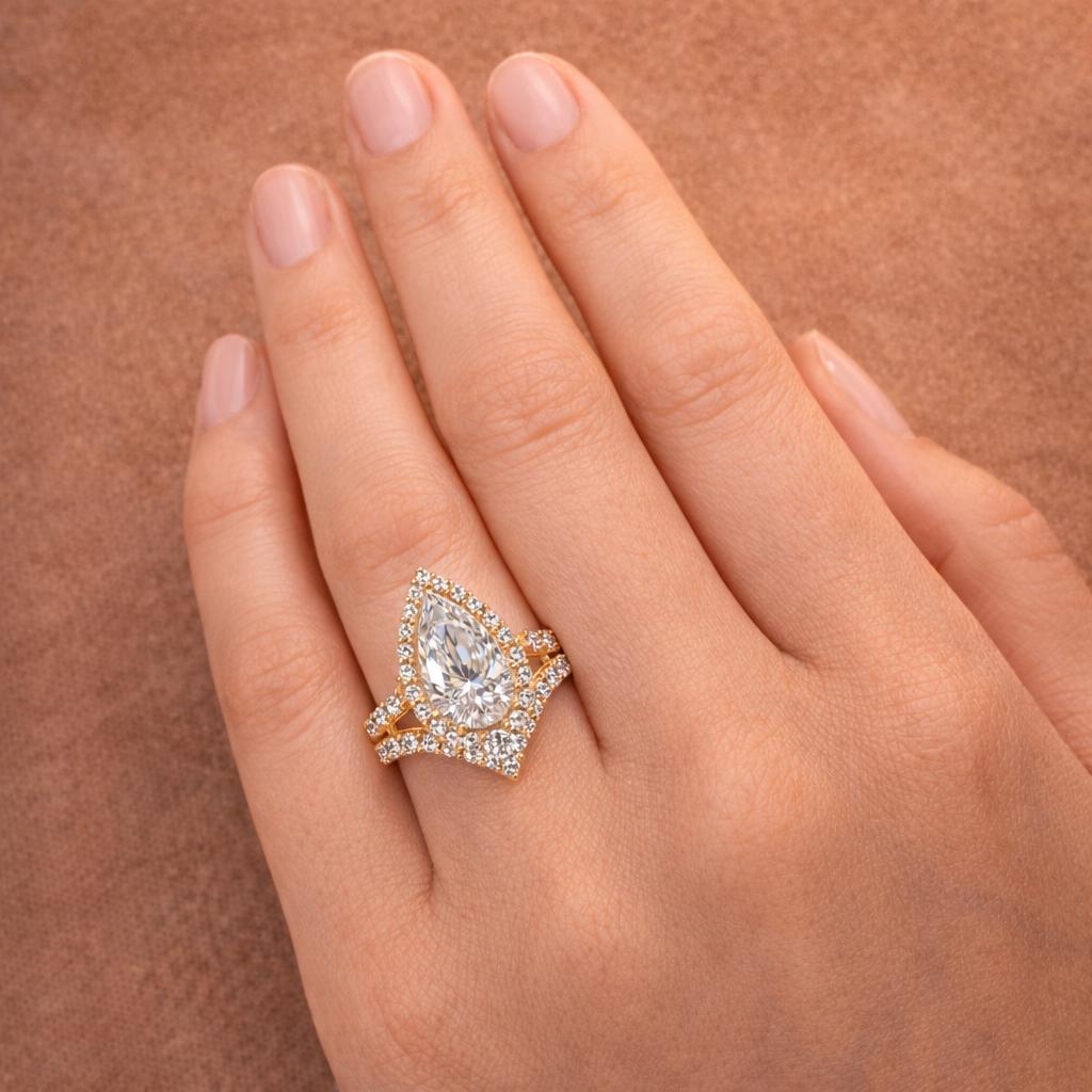 Discover our luxurious 3.00 carat pear-shaped lab-grown diamond engagement ring bridal set, beautifully crafted in solid 18K yellow gold. This IGI-certified set features marquise side diamonds and a matching wedding band, totaling approximately 4.75 carats of brilliant diamonds. A symbol of modern elegance and timeless commitment.