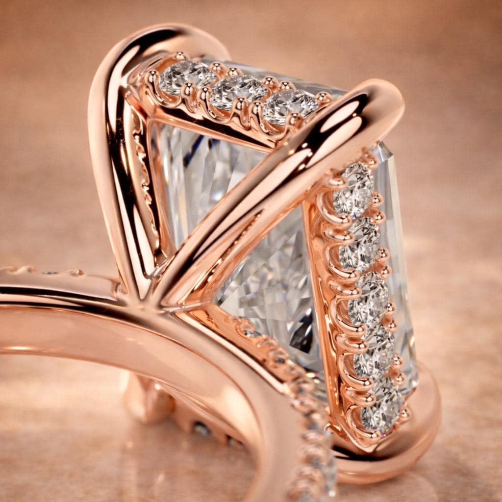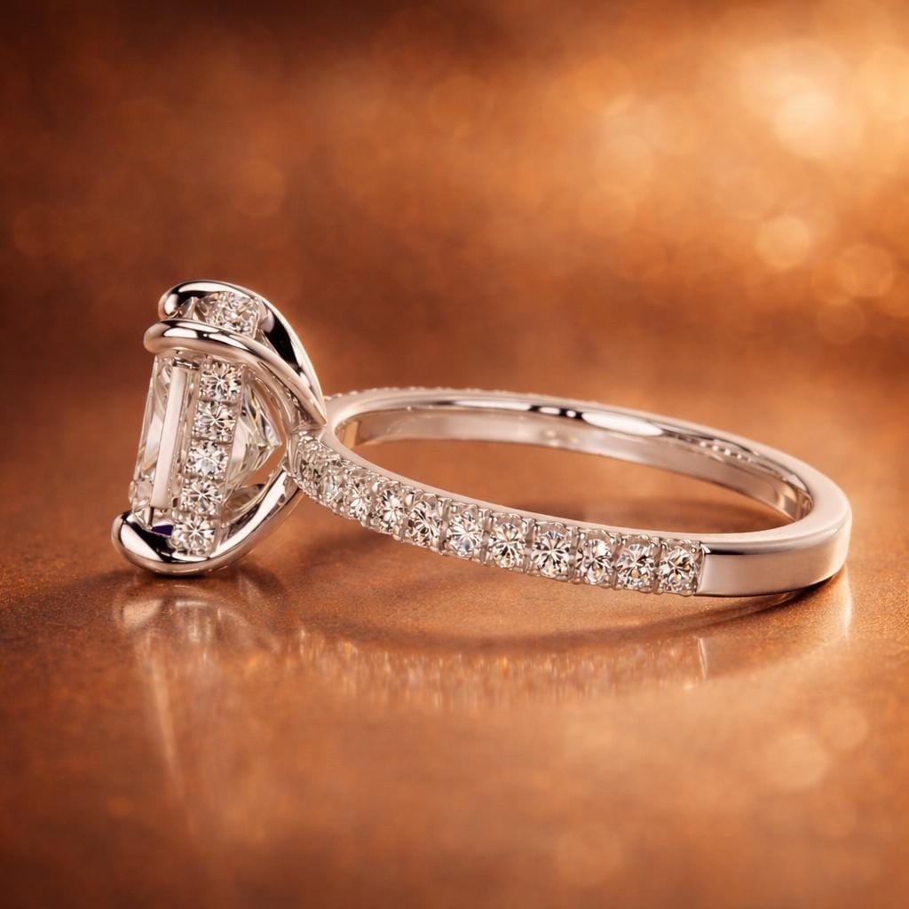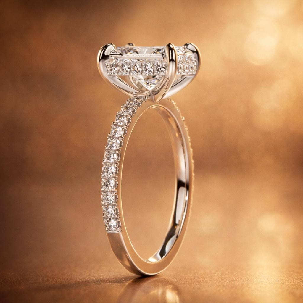 This elegant ring features a hidden halo of brilliant diamonds beneath the center stone, creating extra sparkle while keeping a clean, timeless look.