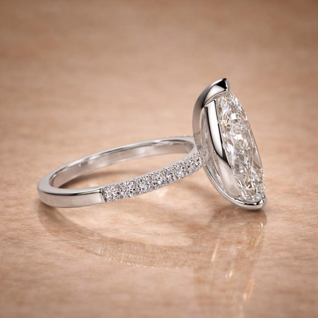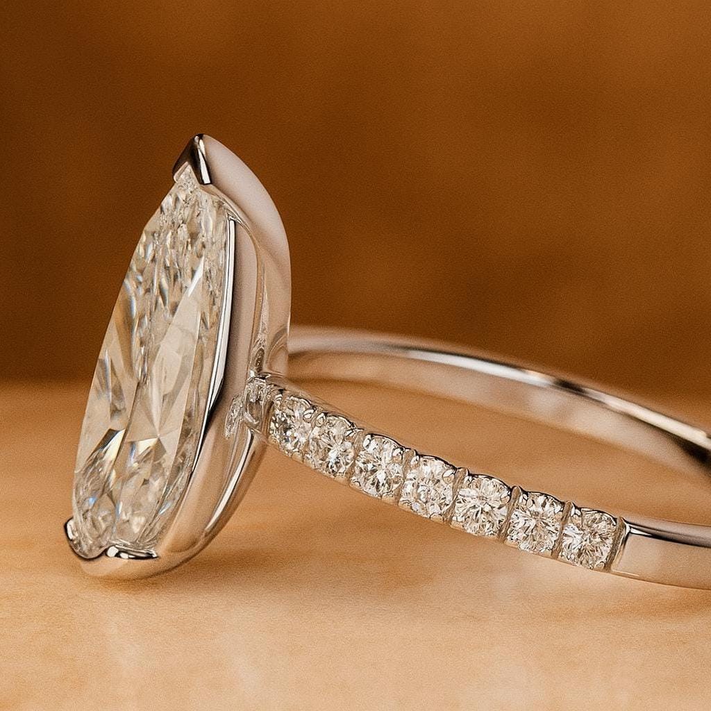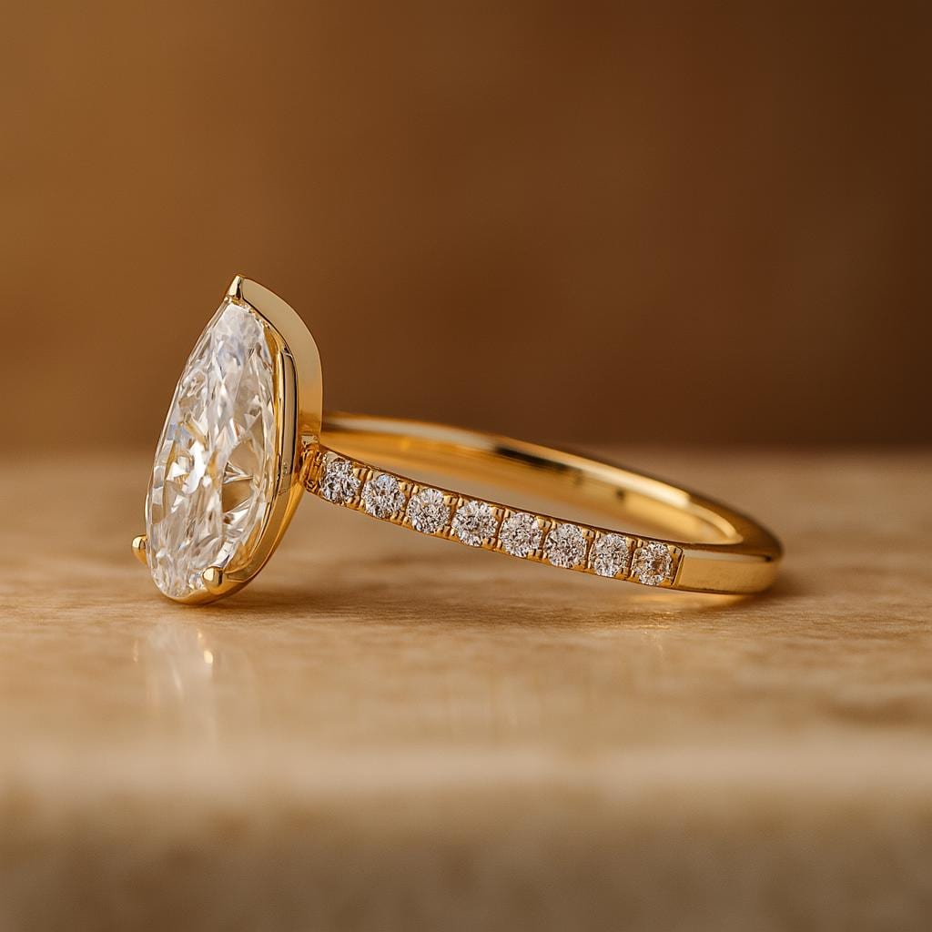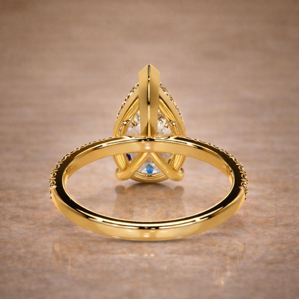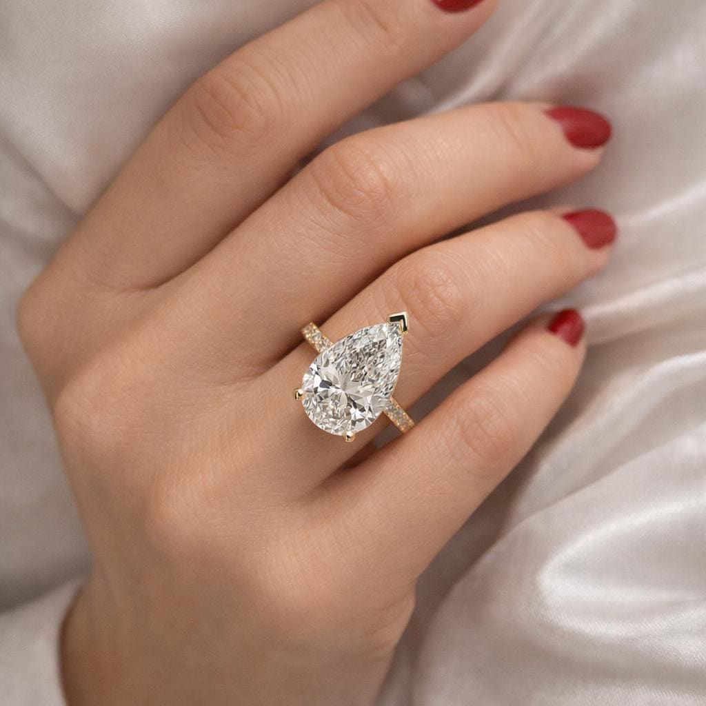 This stunning 4 carat pear-shape lab grown diamond ring is designed to shine from every angle.