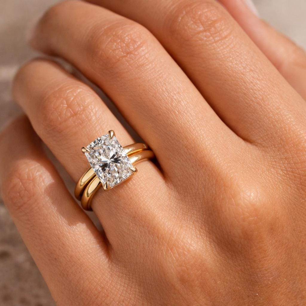 Celebrate your love with this timeless Radiant Cut Lab Diamond Bridal Set, featuring a stunning 2.00 carat E VS1 elongated radiant diamond set in a classic solitaire design with a delicate hidden halo for added brilliance.