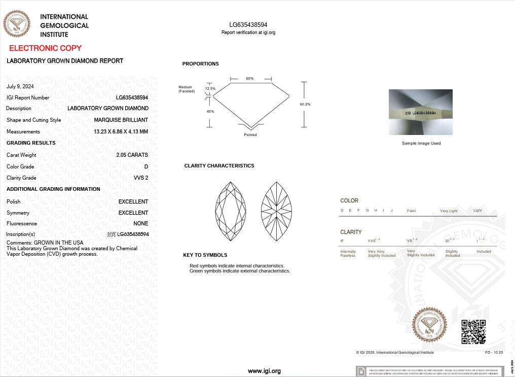 • Center Diamond: 2 ct marquise-cut lab grown diamond — E color, VVS2 clarity