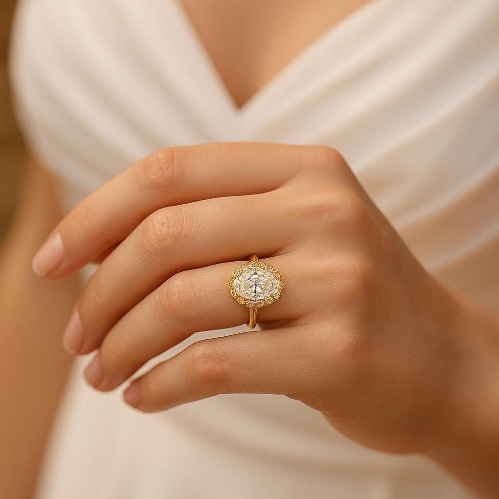 Celebrate your forever with this elegant 1.00 carat oval cut natural diamond engagement ring, crafted from solid 14K yellow gold. At the heart lies a hand selected GIA certified diamond, graded G color and VS1 clarity, ensuring unmatched brilliance and timeless appeal. The vintage style halo setting, adorned with delicate milgrain detailing, gives this oval diamond ring a romantic and refined finish, perfect for those who cherish classic beauty.