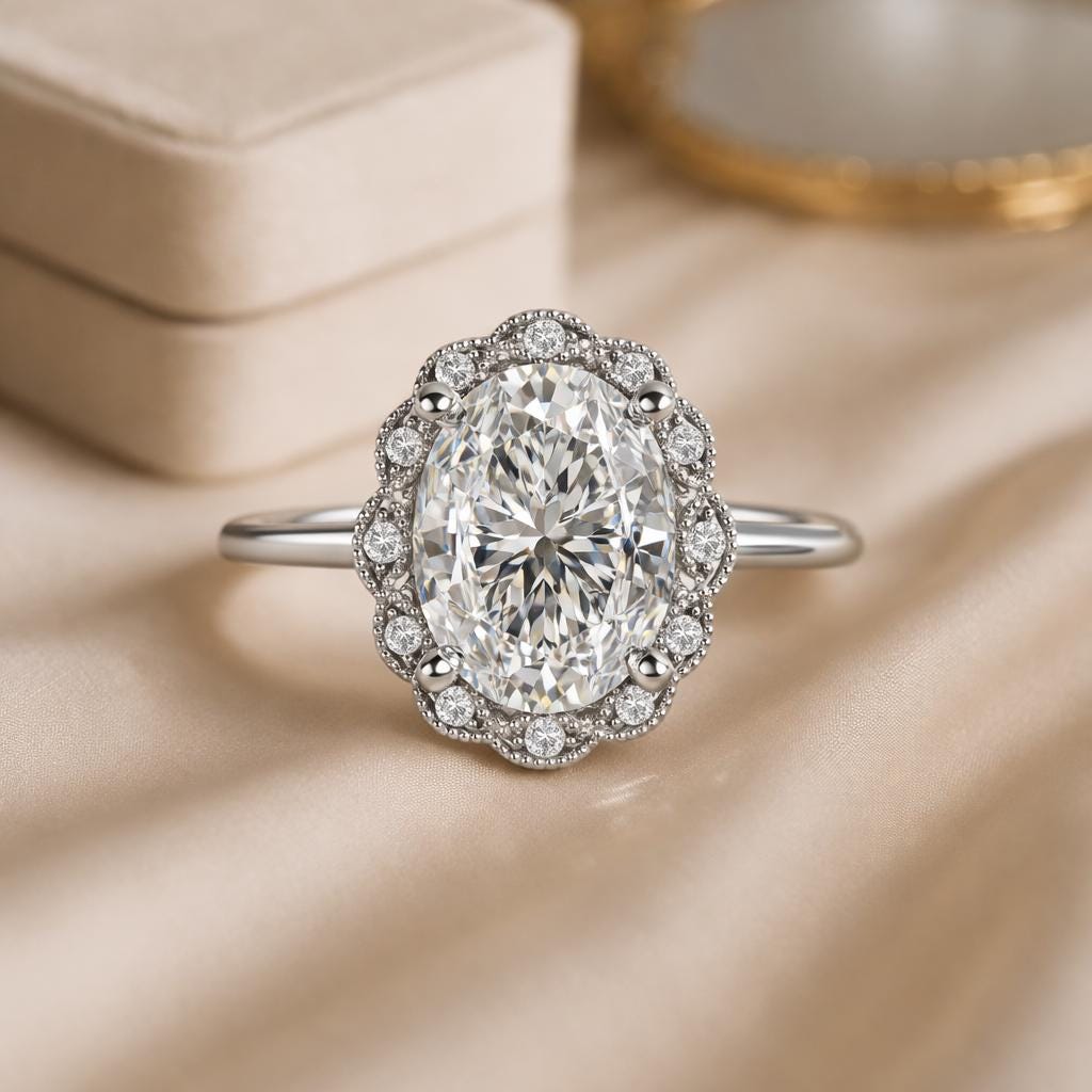 GIA Certified 1 Carat Oval Diamond Engagement Ring | 14K White Gold Vintage Halo