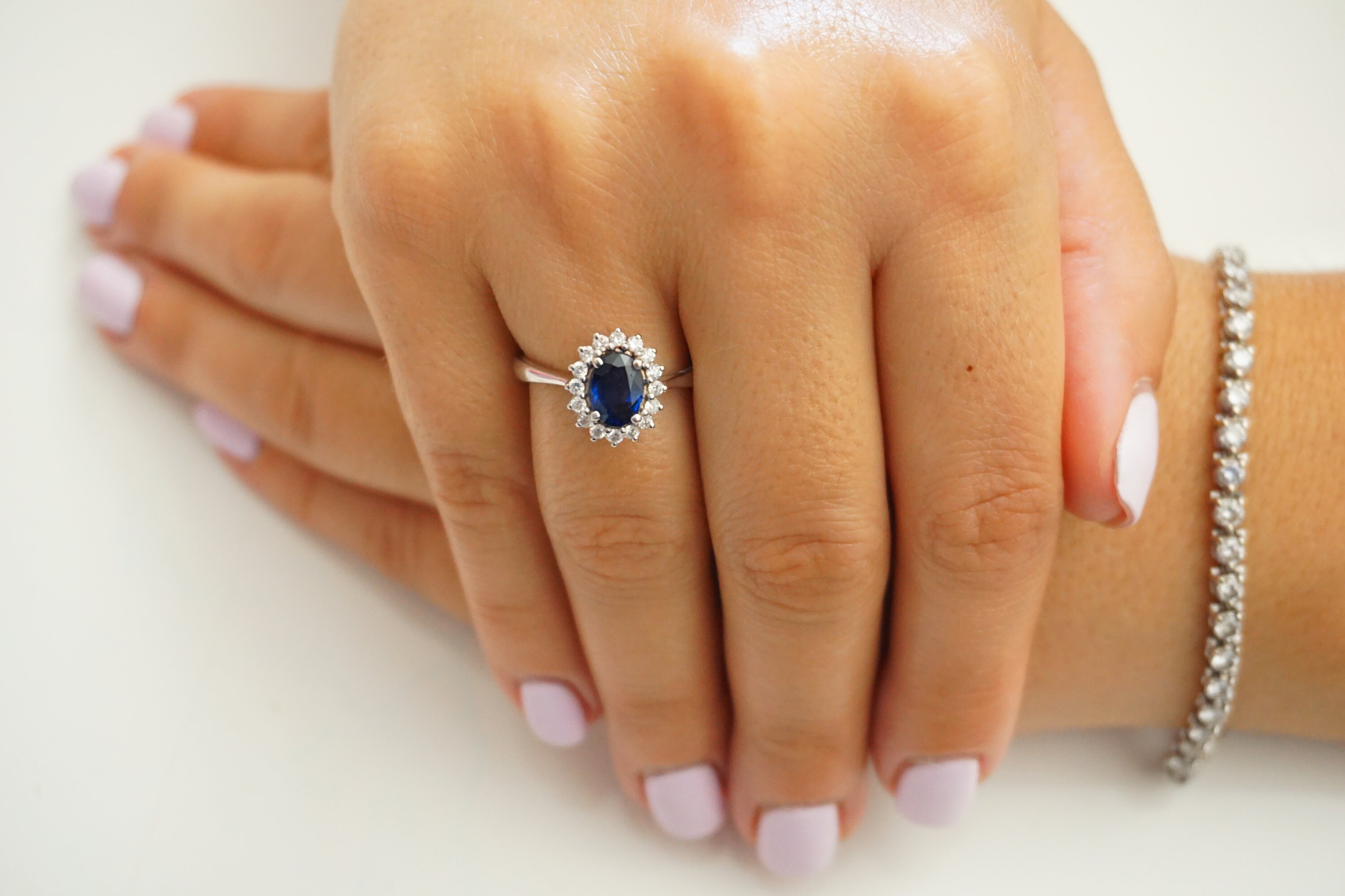 Oval Blue Sapphire Engagement Ring, Diamond Halo, 14K White Gold